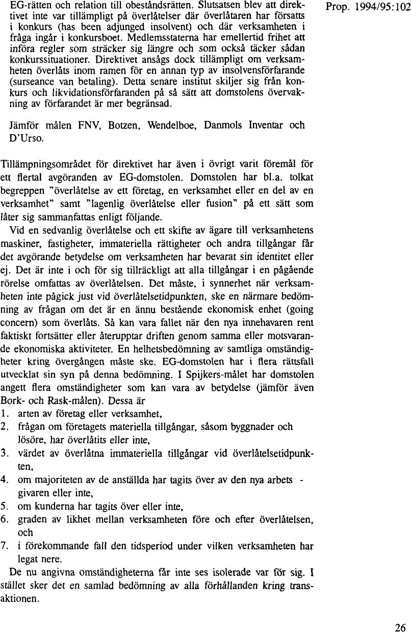 EG-domstolens praxis ger ytterligare underlag för samma slutsats. Belysande i detta avseende är domen i Spijkers-målet (mål 24/85 [  ], 1986 ECR 1119). Enligt denna dom är avgörande, om ”verksamheten” vid övergången har bevarat sin identitet. Är det en bestående ekonomisk enhet – en ”going concern” – som har går över? Enligt EG-domstolen skall den frågan avgöras efter en helhetsbedömning av samtliga omständigheter kring övergången. I Spijkers-domen anger EG-domstolen sju kriterier som får särskild betydelse vid en sådan helhetsbedömning (jfr prop. 1994/95:102 [ pdf |Paragraftecken|Ikon för riksdagen ] s. 26 [  ]).